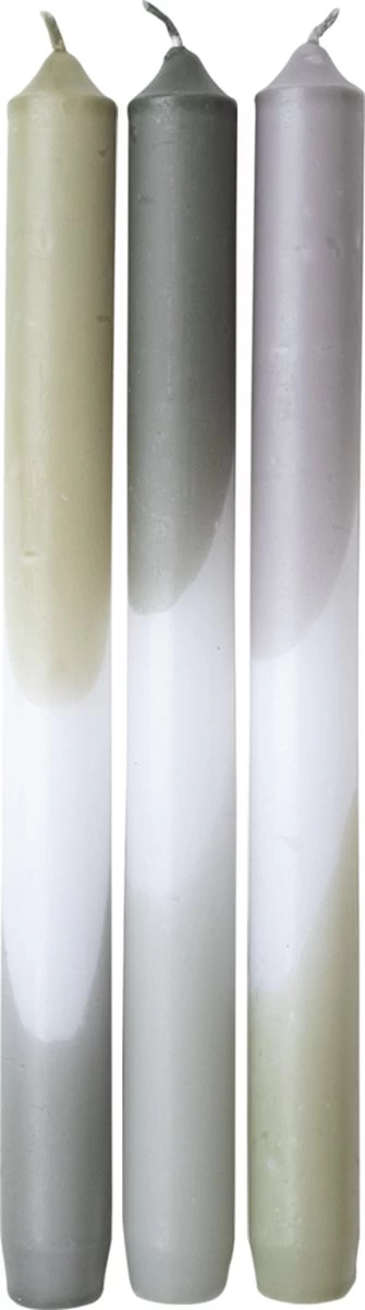 Dip dye candles set van 3 in groen. Deze kaarsen set is leuk om kado te geven. De kaarsen matchen met elkaar en geven een warme sfeer aan je huis. De kaarsen zijn 24 cm hoog en hebben een brandtijd van +/- 9 uur. De kaars is 2 cm dik. Er zijn meerdere kleuren sets DIP DYE candles.