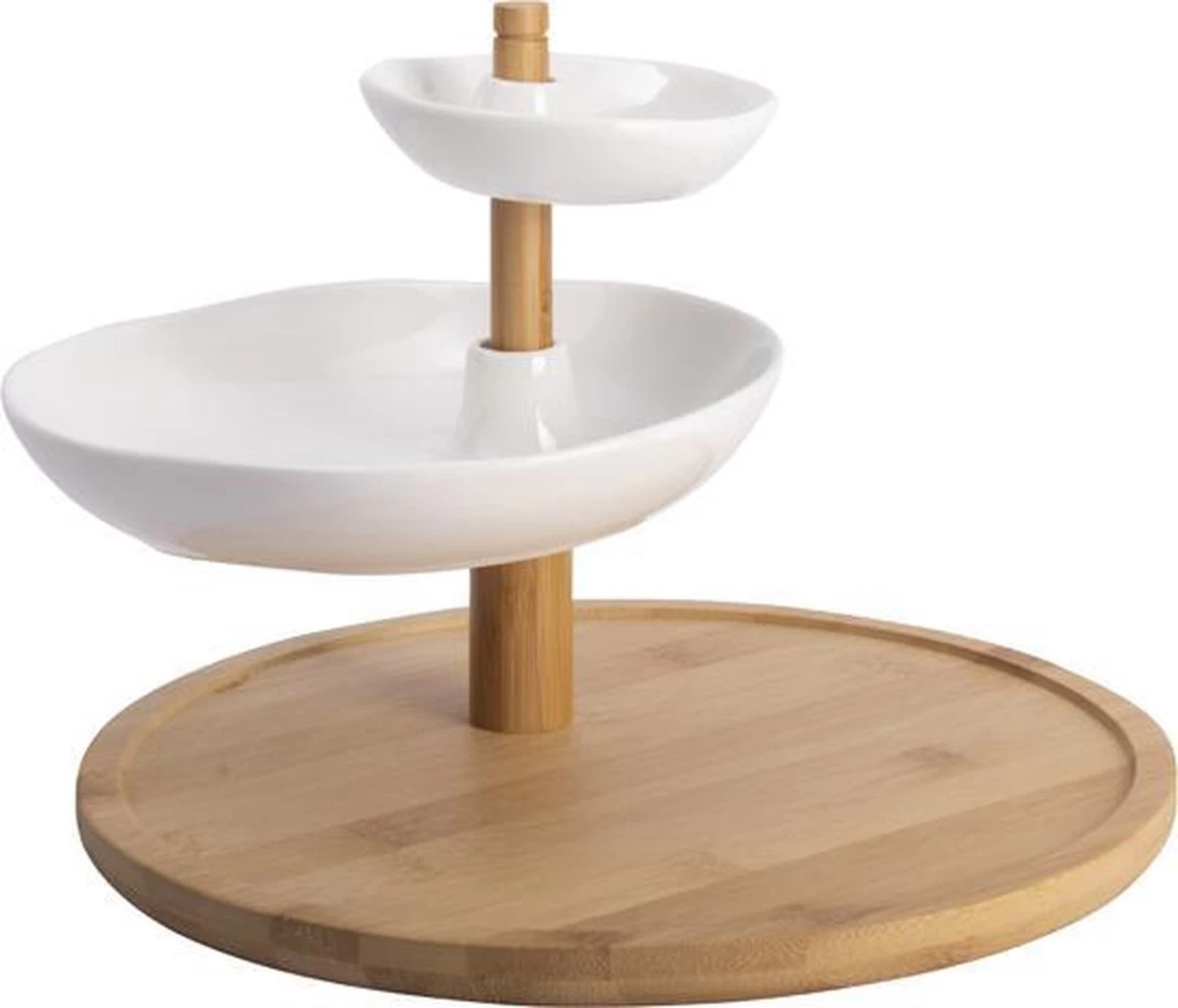 Met deze GUSTA etagère til je de borrel letterlijk naar een hoger niveau! De drielaagse serveeroptie is afgewerkt met bamboe en wit aardewerk. Daarnaast zijn de witte bakjes draaibaar en zorgen ze voor een speelse manier van uitserveren. Als je de etagère wilt reinigen, stop je de bakjes gewoon in de vaatwasmachine en was je het bamboe het liefste met de hand. Bekijk ook onze andere etagères van bamboe en metaal. Specificaties: · Drielaags · Wit (bakjes) · Bamboe/Aardewerk · ø 28,5 cm · 28,5 x 28,5 x 24,5 cm (LxBxH) · Uitsluitend handwas