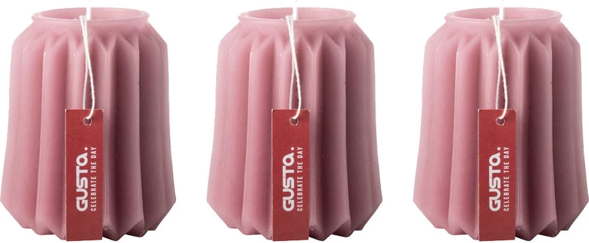 De geribbelde kaars heeft een diameter van 7,5 cm en een hoogte van 8,5 cm. De roze kaars is gemaakt van kaarswas en heeft een brandtijd van 26 uur.