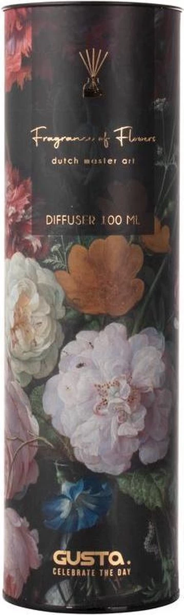 “Wat een prachtplaatje, deze GUSTA diffuser uit de serie Hollandse Meesters. Deze diffuser of geurstokjes worden geleverd in een prachtige koker waar het herkenbare design van “”het Stilleven van Bloemen in een Gouden vaas”” van schilder Jan Davidsz. de Heem, vanaf schittert. Gebruik de koker daarom ook vooral voor andere klusjes, zoals het opbergen van pennen, potloden of andere prularia. Weggooien is zonde! De diffuser heeft een diameter van 8cm en is 24 cm hoog met de stokjes meegerekend. Met de meegeleverde dop kun je de fles luchtdicht afsluiten zodat je zelf bepaalt wanneer je de geuren door de kamer wilt verspreiden. Zo gaat je geur langer mee! De geur is te omschrijven als bloemig met tonen van vanille en cederhout. Naast een heerlijke geur is de kaars ook nog eens een prachtexemplaar om op je dressoir, tafel of in de badkamer te hebben staan. Deze geurkaars is net zo leuk om te geven, als om te krijgen. Specificaties: – De geur is bloemig met tonen van vanille en cederhout. – Stilleven van Bloemen in een Gouden vaas – ø 8 cm – 25 cm hoog ”