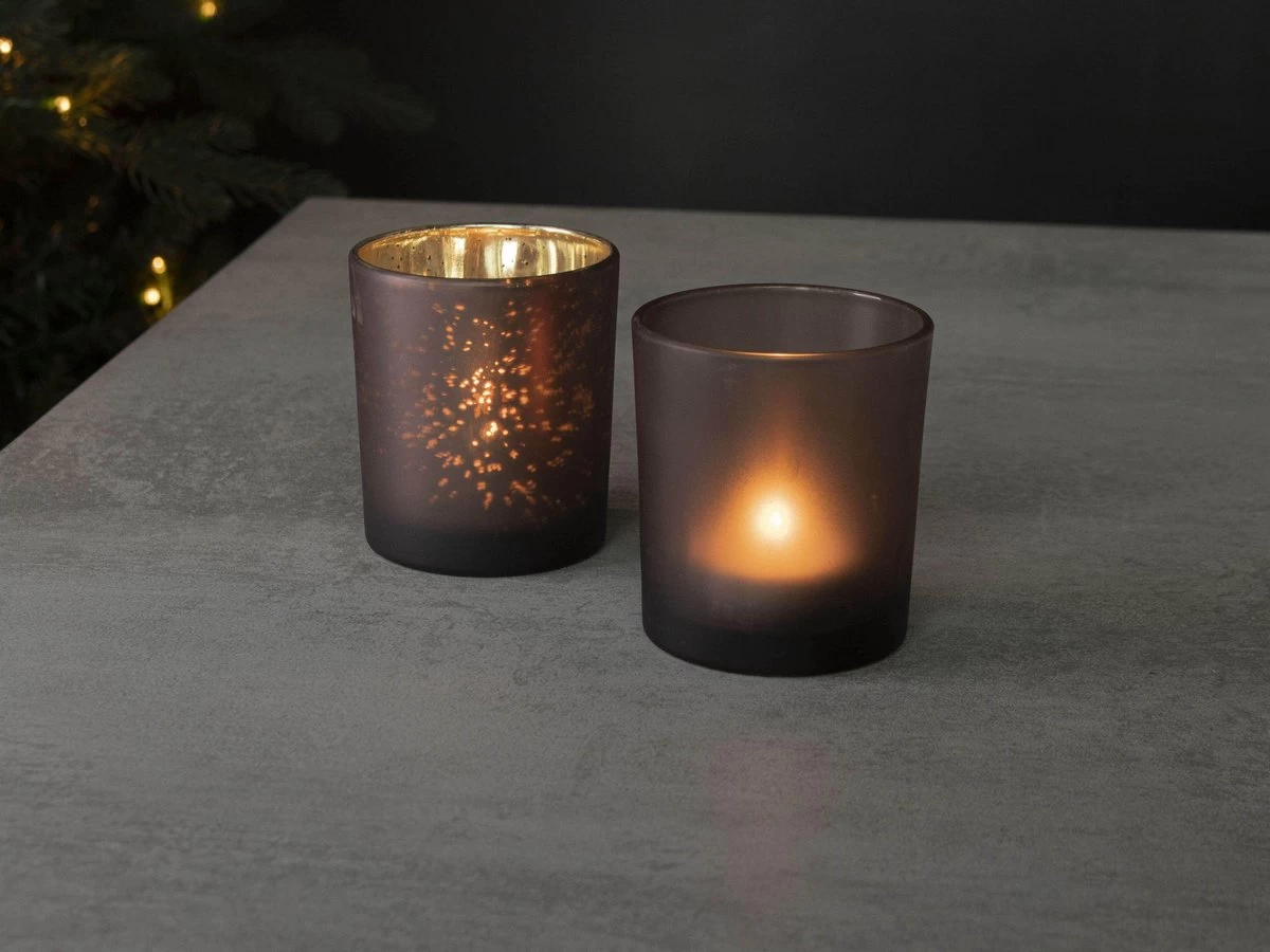 Deze paarse kaarsenhouders zijn super stijlvol. Door zijn goude glittering creëer je een fantastisch licht effect. Voorzie de houders van een waxine lichtje en maak het zo donker mogelijk in huis, zo heb je het beste effect! Afmeting Ø7x8cm.